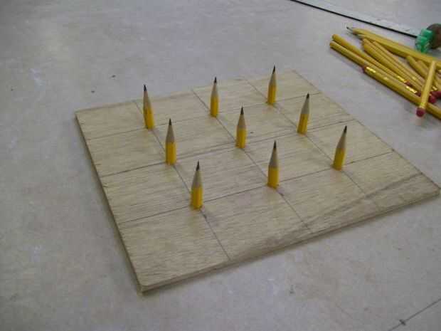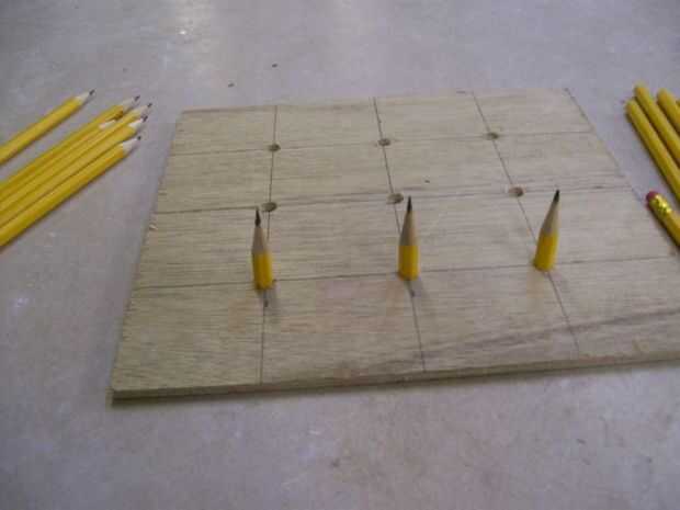 Coloque los lápices shorty en los agujeros. He añadido un poco de pegamento caliente en la parte trasera para mayor seguridad. Llene la Junta. Encontrar un forro liso tamaño convenientemente para su papel y la cinta juntos. Montar como se muestra.