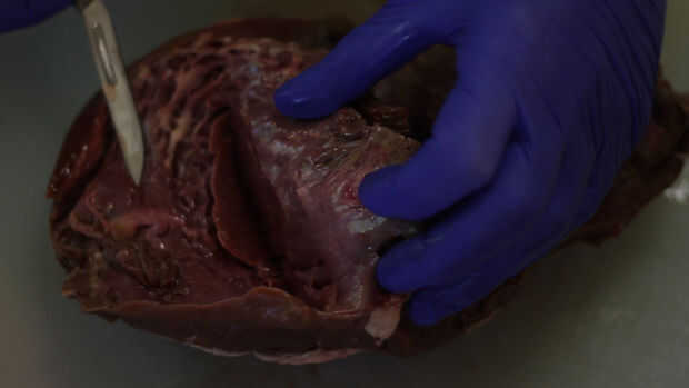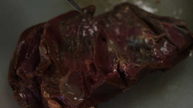 No vas a obtener siempre un corazón Virgen de una carnicería o matadero. Ellos tienen que revisarlo para asegurarse de que la vaca no tenía Dirofilaria immitis. No quiero comerlos. Así que el corazón se rebanar abierto para revelar la cámara y anatomía general interior---válvulas, tejido conectivo, etc..