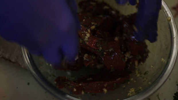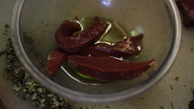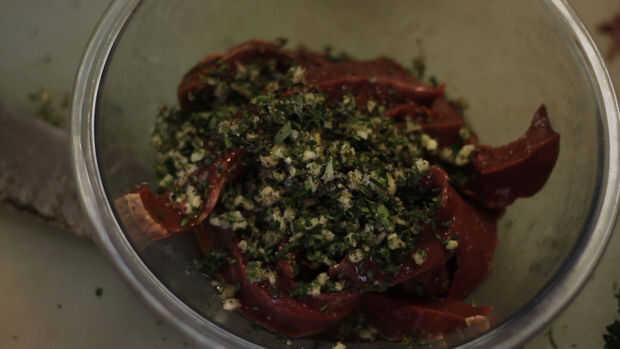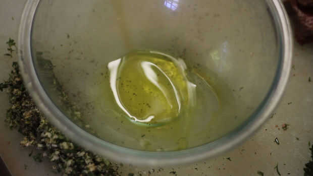 Dice arriba sus hierbas. Dice arriba el ajo. Salarlo. La pimienta lo. Añadir un poco de aceite de oliva. Poner tu corazón a él! Y lo deje reposar un rato. A las pocas horas. Que este se siente en la nevera durante la noche.