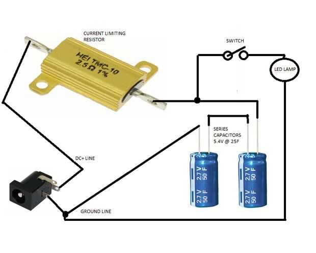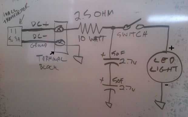 El positivo de la fuente de alimentación de 5v se conecta a un bloque de terminales (o un DC Jack si tiene uno) a un lado de la resistencia de potencia de 2,5 ohmios 10W. La bornera o jack se utiliza para que usted puede conectar y desconectar el transformador de pared en cualquier momento. La resistencia se utiliza para limitar la corriente de la fuente de alimentación a los condensadores. Sin esto, muy bien puede dañar la fuente de alimentación. Cuando la carga, este resistor se calentará, pero no tarda mucho en cargar la linterna del condensador utilizando este valor, así que no vas a tener que preocuparse demasiado. Sin embargo, al montar esta resistencia en la linterna, intentar mantenerlo aislado del plástico de la linterna.