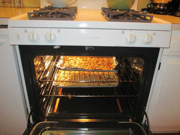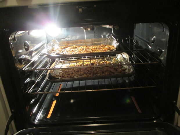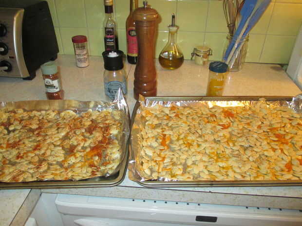Creo que horno en 325 grados F durante unas horas. Después de una hora me le saque las bandejas y tratar de mezclar y mezclar las semillas alrededor. Use una espátula de plástico si es guarnición sus hojas con papel de aluminio, así que usted no rasgar el papel de aluminio cuando usted es raspar las semillas para voltearlas.