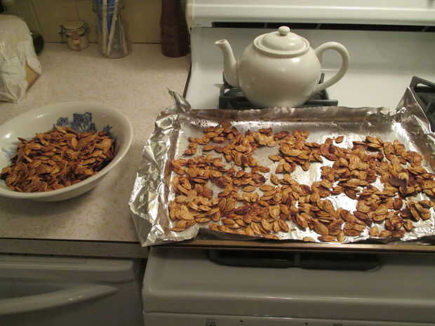 Ah y la noche siguiente hice otra tanda porque mi hija había tallado calabazas más dos a la mañana siguiente. Los que además aderezado con canela y azúcar. YUM! Esos son mis favoritos.