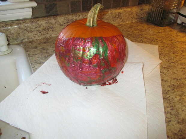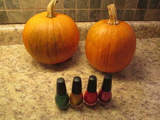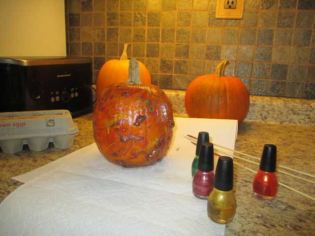 Quería probar una técnica de marmoleo. Mark Montano hizo una hermosa versión de spooky-negro-y-oro, aquí en Instructables, con una pintura de acrílico especial que cuece al horno. No quiero pintar, o cebar las calabazas para encubrir sus colores naturales. Me topé con otro tipo de veteado, con laca de uñas y un cubo de agua. Ella no proporciona un video o fotos de su realmente hacerlo, sólo una descripción por escrito, así que estaba ansioso de ver qué clase de lío horrible o resultarían resultado suerte. (un poco de ambos, pero sobre todo el primero)