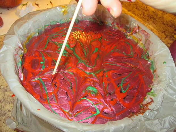 El polaco todos los flotadores en la parte superior. Arrastró a la punta (bueno, al principio no me gustó y los pinchos tienen cubiertos de mugre de laca) a lo largo de todos los colores, creando un efecto de mármol.