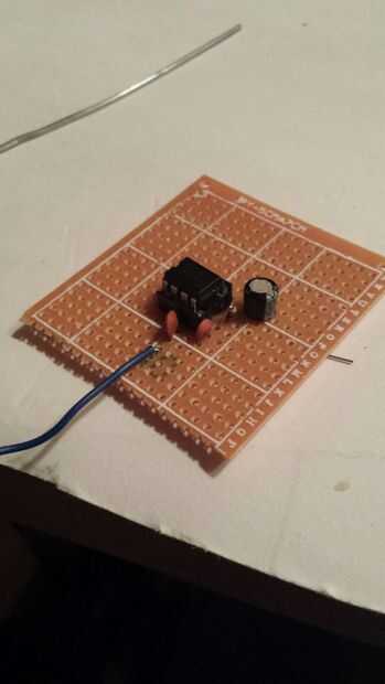 Para comenzar a construir el circuito de corte un poco de perf board para caber el caso. El pueblo del circuito después de la schmatic. Asegúrese de mantener las conexiones cortas y aseadas para evitar recoger las señales de radio y otros ruidos. Primero agregar la toma del centro de la tabla seguida por la tapa de 100nf entre pin 8 y pin 3. El siguiente es la tapa de 100nf entre 3 pines y un cable a la patilla central del bote. Agregar la salida se conecta el positivo de la PAC de 220uf a pin 5 del IC. El agregar el RC paso alto filtro conectando el resistor de 10 ohm al pin 5 y luego a tierra a través de los 4.7nf tapa. Conecte ambos pines 2 y 4 a tierra así como pin 6 con el interruptor VCC. Agregar la tapa de 220uf entre alimentación y masa Esto evitará que tu circuito consiguiendo muy staticy. Tarde encontré que tenía que saltarse la tapa de 220uf a la salida. No sé por qué pero no funciona después de tomó de la mesa del pan a la Junta de perf. Si alguien sabe por qué por favor hágamelo saber.