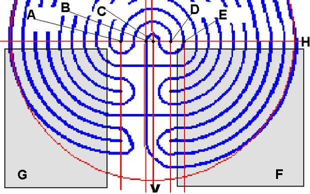 El cuadrante más bajo de la mano derecha (F) de la 3 ' reloj de o a 5 ' o posición se dibujan desde el punto E, comenzar contra línea H y parar antes de cruzar la línea vertical de E. Lo mismo con el cuadrante izquierdo (G) en el 7:00 a 9 ' posición de reloj o, los arcos se dibujan desde el punto A, parando antes de que cruzan la línea que se extiende hacia abajo desde el punto A