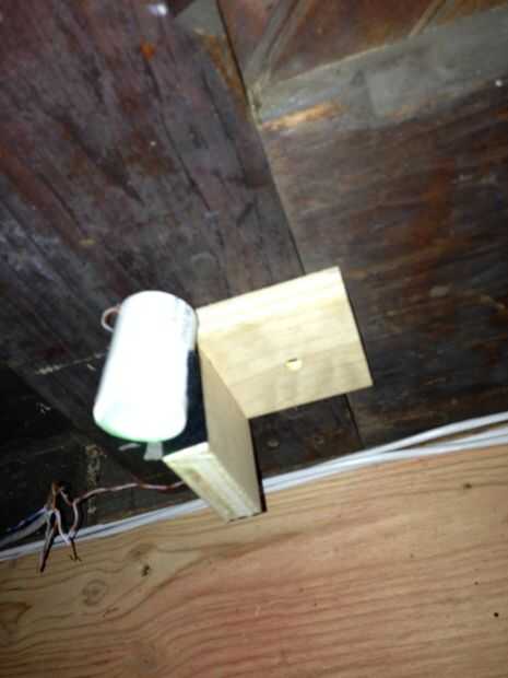 Otra vez, como con el montaje de láser, haz 2 pequeños pedazos de madera y perfore un agujero en cada uno como se muestra en la imagen siguiente. Fije el tubo de PVC a la madera con Velcro.