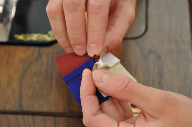 Observe cómo el prensado tiene simetría rotacional. Esto es importante. También es importante que todos ellos girar en la misma dirección. Sacarlos a todos de vuelta en la misma dirección es administrado por tener siempre el margen superior hacia arriba, como van a través de la máquina de coser.