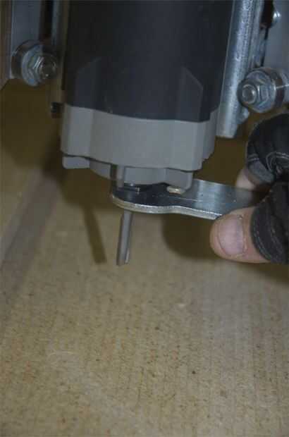 Nuestro router sólo va una velocidad de rotación y maximiza a 25 pulgadas lineales por minuto, por lo que el único control que tenemos es cómo profundo cortes por paso, y las pulgadas por minuto velocidad que viaja a través del material. Lo planeado para cada paso en. 25". Antes de cualquier maquinaria es activada, instalar la broca en el router que tengo. Ser muy cuidadoso, son muy afilados. No sé que, pero, hay una amplia gama de curitas y compresas fácilmente disponibles en nuestra tienda, por si acaso.