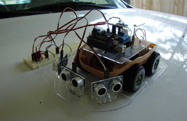 Este es mi intento de diseñar y construir un obstáculo evitando robot! RekaBot (nombrada de un hada (:) puede detectar obstáculos con un sensor de ultrasonidos que puede moverse con la ayuda de un servo. Basado en las medidas que toma, las pistas son