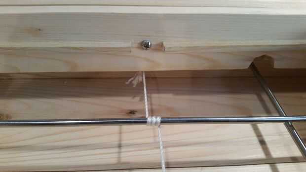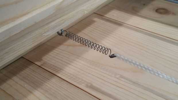 Atar un extremo de la cuerda para un ojo (la más cercana a las barras) y luego atar el otro extremo a la primavera. Cuando todo es cómo te gusta, envuelva la cuerda alrededor de la varilla tres veces y enganchar el resorte al ojo contrario.