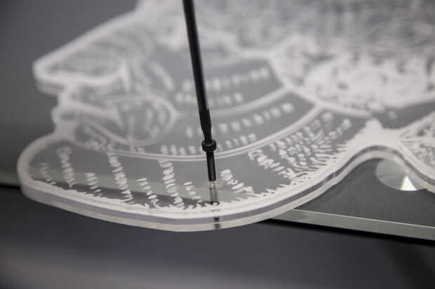 Comience por colocar "Cerebro izquierda de laberinto" para que la porción grabada del acrílico es hacia arriba, y que se puede leer correctamente el texto de inicio y fin. A continuación, coloque la cabeza en forma de pedazo del archivo "Centro del laberinto del cerebro" sobre la primera pieza. Esto puede ser sostenido hacia abajo con los tornillos, pero el camino del laberinto tendrá que ser virado con pegamento. Añadir puntos de pegamento a las porciones del cerebro laberinto y centro en el espacio abierto. Una vez seco, añadir la pelota a la ruta del laberinto. Sello de la bola en el laberinto agregando el "cerebro laberinto derecho" sobre las piezas. Asegure con tornillos de 3. Ajuste en su lugar con las tuercas.