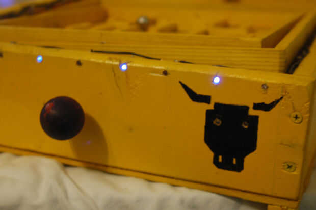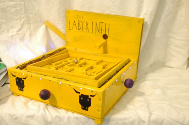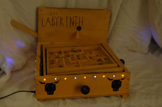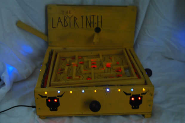 Mi laberinto se activa cuando el jugador tira hacia abajo la palanca a la izquierda. Esta acción tira la bola al principio del laberinto y se comunica con el Arduino que se debe ejecutar el programa. Rápidamente, el Arduino se enciende las luces amarillas y púrpura que bordean el perímetro del laberinto. Porque las bombillas LED están conectadas en un circuito con un temporizador 555, flash en un patrón alterno. Es decir, ellos flash amarillo, púrpura, amarillo, púrpura, etc.. Simultáneamente, el Arduino activa un zumbador piezo pasivo que juega una melodía inquietante y misterioso. Si el jugador desplaza con éxito el laberinto peligroso, ellos son recompensados con una melodía de la victoria. Sin embargo, si caen en un agujero, el timbre juega una canción de la derrota y LEDs bajo el laberinto flash rojo. También, los ojos de los minotauros en el frente del juego Brillará intensamente un rojo helado. He incluido un video del laberinto en acción más abajo.