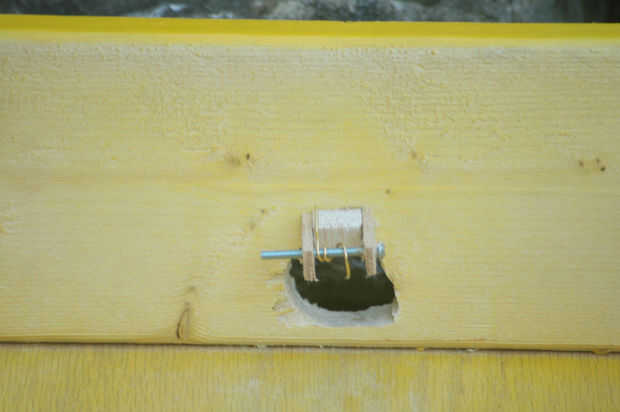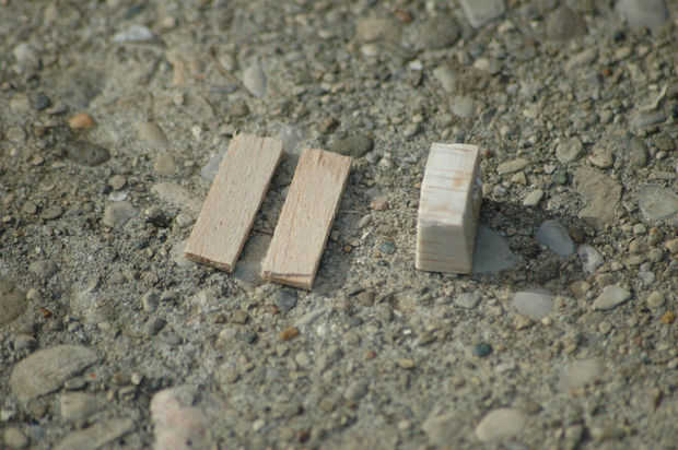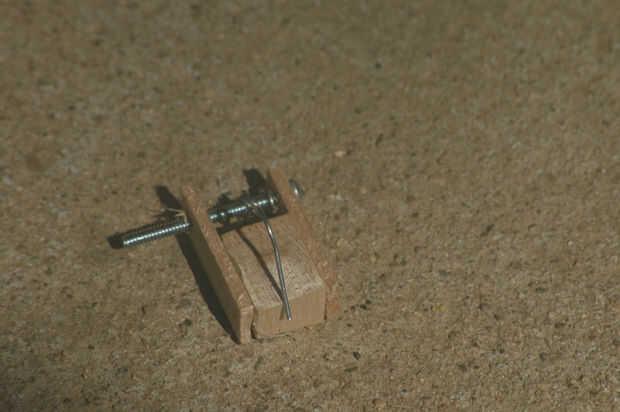 A continuación perfore un agujero en la parte posterior del laberinto para que el mármol puede salir al terminar el juego. Para lograr esto, simplemente deslice la parte inferior de la caja y marque el espacio entre los dos triángulos. A continuación, perfore un agujero en el lugar marcado. Asegúrese de que el agujero se perfora con un ligero ángulo. Esto asegurará una transición sin problemas cuando salga del mármol. Una vez finalizado ese paso, coloque el fondo nuevo y dejar caer una canica para probar que sale correctamente. Si el mármol está alcanzando en un borde, utilice una lima o papel de lija para remediar el problema. Finalmente, usted necesitará una manera de controlar cuando ha caído el mármol. Para hacer esta toma de madera de balsa y córtela en estas longitudes: 1 "x 1/4" x 1/16 "(se necesitan dos de estos) y 1/2" x 1/2 "x 3/4" (sólo se necesita uno de estos). Salir de la pistola de pegamento caliente y colocar las piezas como se muestra en la foto de arriba. Continuación del hilo de rosca un tornillo entre las dos piezas de madera (ver la tercera foto de arriba). Por último, envolver un clip de papel alrededor del tornillo de la máquina que cuelgue libremente.