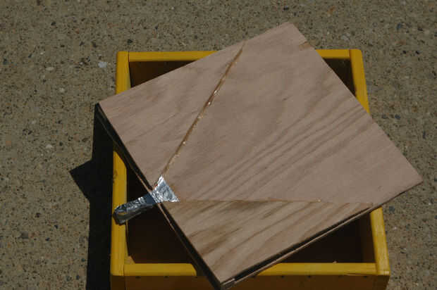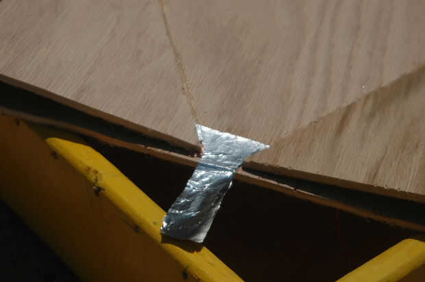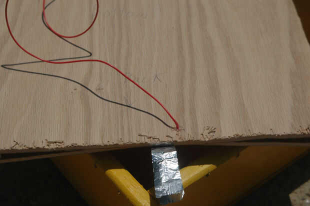 ¿Para qué sirve el papel de aluminio? Probablemente, usted ha sido preguntando esto desde la primera lectura en mi lista de materiales. Bien, pregunto no más. El papel de aluminio se utiliza para crear una conexión eléctrica cuando se rueda la bola de metal. La pieza de abajo con papel de aluminio de la capa como se muestra arriba. Doblé mi hoja por lo que es más gruesa y más duradera. A continuación, perfore un agujero desde la parte inferior hasta el papel de aluminio. Después de esto, haga correr el cable rojo a través de la parte inferior y adjuntar a la hoja, para que forma una sólida conexión eléctrica. Añadir pegamento para hacer cumplir la conexión cuando sea necesario.