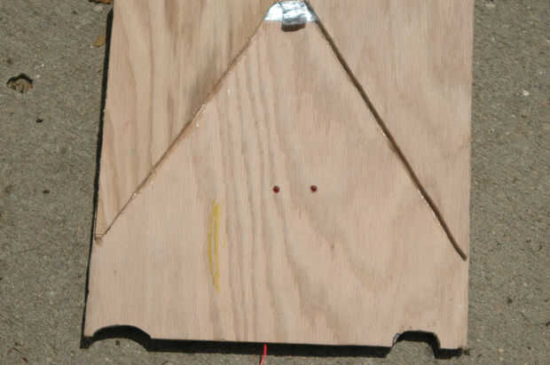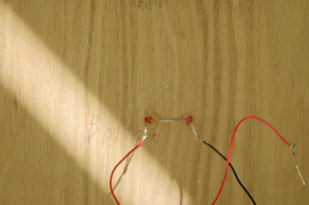 A continuación, agregue algunos LEDs rojos en el fondo. Estos LEDs iluminarán misteriosamente cuando se pierde el juego. En primer lugar, haga dos orificios en la parte inferior. A continuación, caliente pegamento dos bombillas de 6mm en los agujeros. Soldarlos juntos y conectarlas al circuito principal. Después de eso, hacen dos muescas en la parte superior de la pieza inferior. Los cables que suben desde la parte inferior permite estas dos muescas.