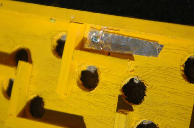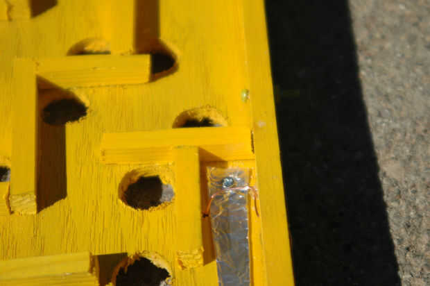 Similar a las otras entradas en este proyecto, el Arduino sabe cuando el juego se gana por medio de una señal digital. Colocar papel de aluminio en el final del laberinto. Perfore un agujero a través del laberinto y fije la lámina con un tornillo de máquina. A continuación añadimos un hilo de cobre asomando ligeramente por encima de la lámina. Fije el cobre a 5v y el papel al suelo. Ahora, cuando llega el rodamiento de bolitas de metal en el acabado se completa un circuito.