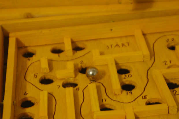Por último, para terminar el proyecto coge un rotulador morado. Trace una línea en la ruta prevista de su laberinto. Marque un número junto a cada agujero para que los jugadores pueden determinar su progresión a través del laberinto. Escribí "El laberinto" en la esquina superior izquierda de la mina. También, elegí mi manijas de color púrpura también.