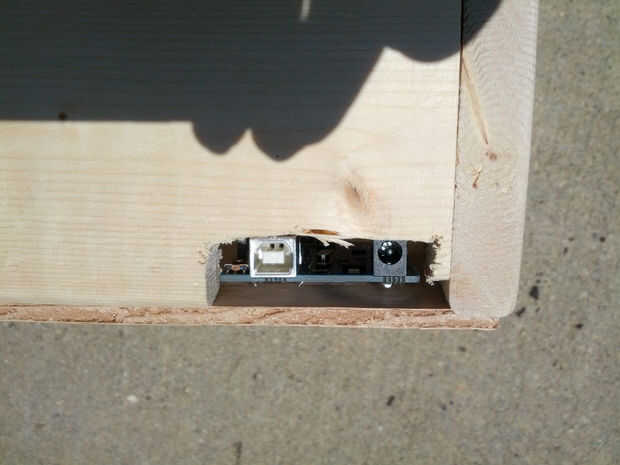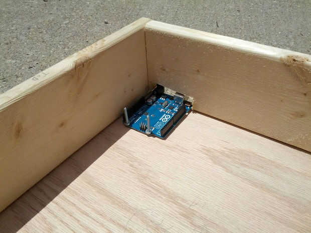 Después de la parte inferior en su lugar, es hora de agregar el corazón del proyecto, el Arduino. Libremente Coloque el Arduino en una esquina de la caja con el USB y puertos en el lado de alimentación. Coge un lápiz y marcar un punto para los agujeros en la parte inferior de la caja. Estos agujeros se utilizará para conectar Arduino a la caja. Tornillos de máquina se enroscará a través de la parte inferior de la caja y el microcontrolador. A continuación, coge un taladro y hacer agujeros en los lugares apropiados. Después de comprobar para asegurarse de que la placa de circuito se adapta correctamente, quite la parte inferior y corte un orificio para permitir el acceso a la USB y tomas de energía. Vuelva a colocar la parte inferior y apriete la Junta en su lugar con tornillos de máquina.