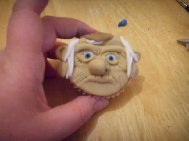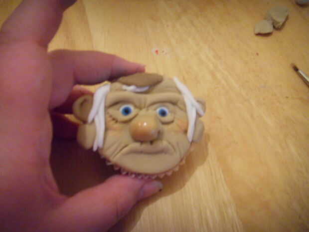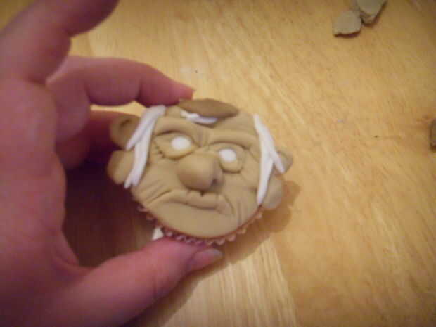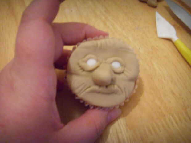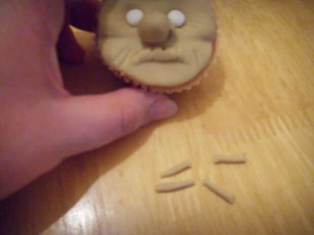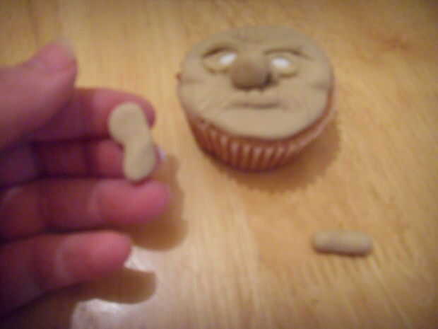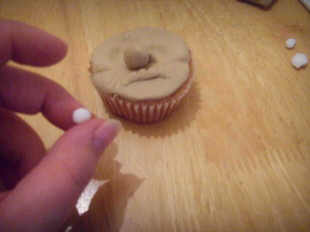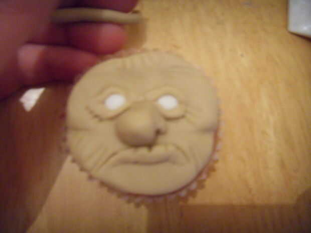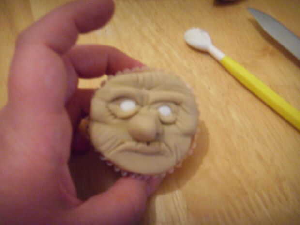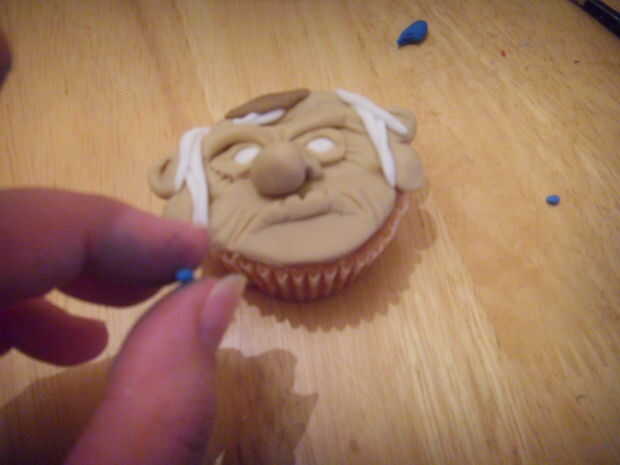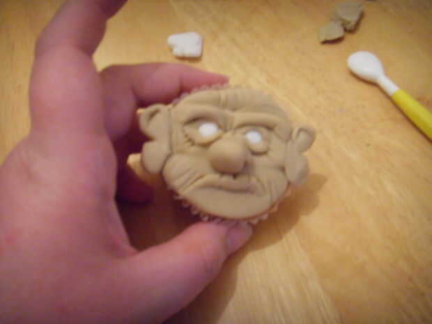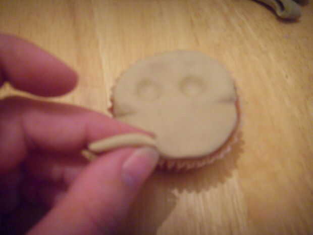 Hacer 4 salchichas muy pequeñas y finas de pasta. Coloque encima y debajo de cada ojo como los párpados. Marca las arrugas/cuervos pies al lado de los ojos.