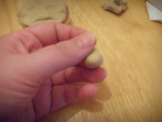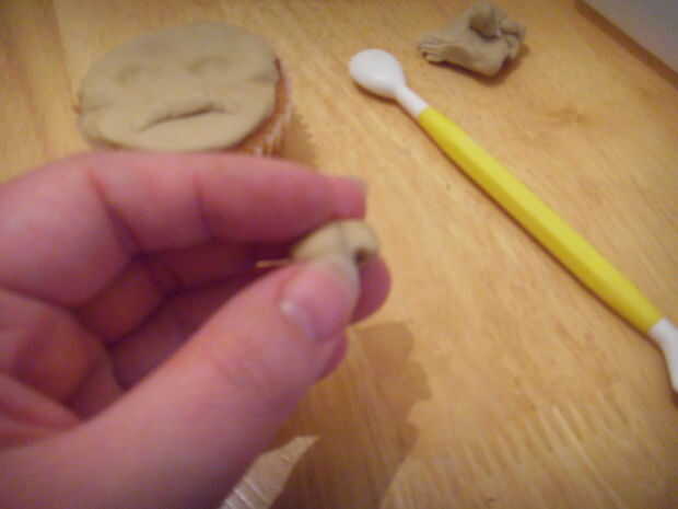 Una salchicha pequeña de pasta para el labio inferior del rodillo, palillo a las líneas de arrugas de cara y marca a lo largo del borde superior con la herramienta de filo recta.