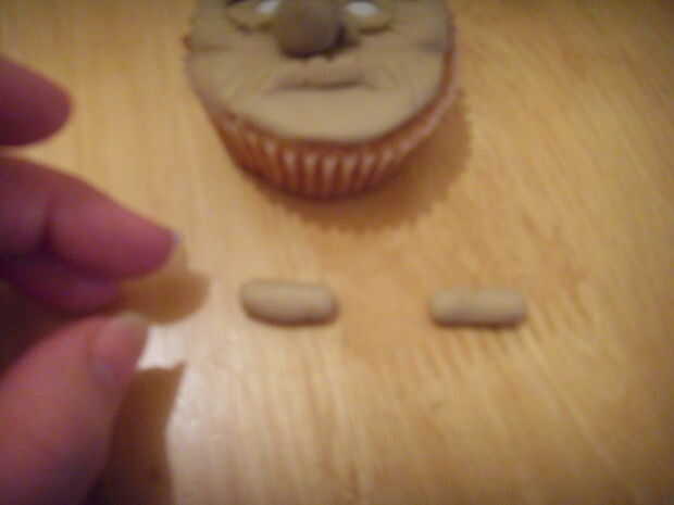 2 salchichas de goma del rodillo, aplanar y forma de cacahuetes (ancho superior e inferior, estrecho en el centro) y pegan en el lado de la cabeza como orejas. Lóbulo de marca y la parte superior con la herramienta de borde recto.