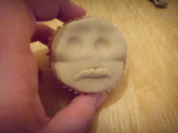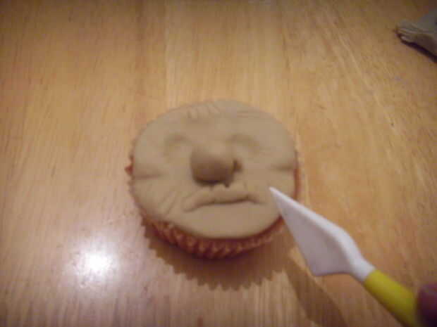 Cubrir la torta en pasta de azúcar de tono de piel. Con la herramienta de filo recta marca las mejillas a ambos lados de la cara, mitad de camino.