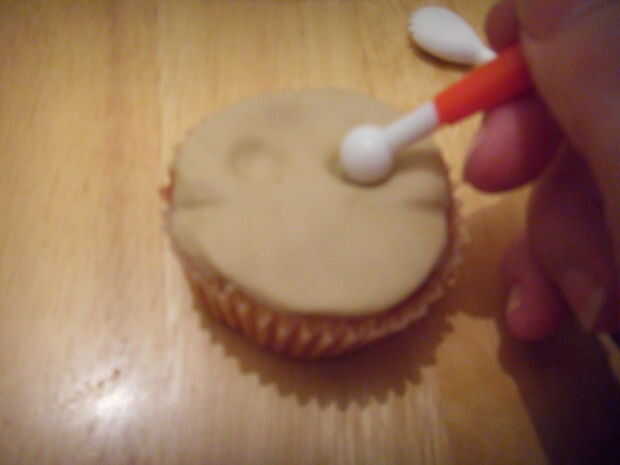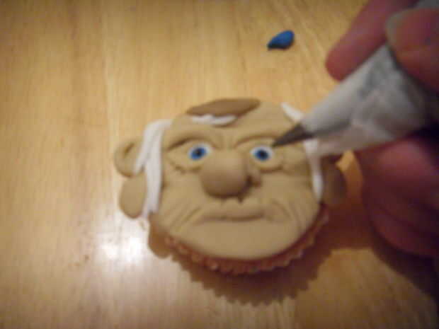 Rodillo salchichas muy delgadas de pasta de azúcar blanco, los ponen al lado para hacer el pelo. Forma el pelo alrededor de sus oídos.