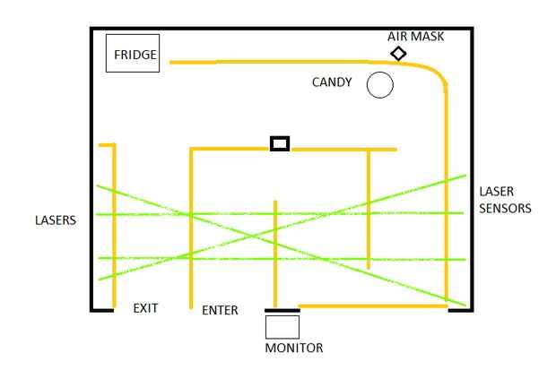 El garaje está trazado para que los huéspedes tendrían que cruzar los rayos láser tantas veces como sea posible. Punteros láser sólo 4 fueron utilizados, pero la temporada tuvo que esquivar rayos láser 16 veces.