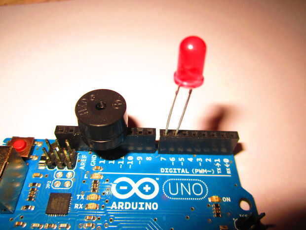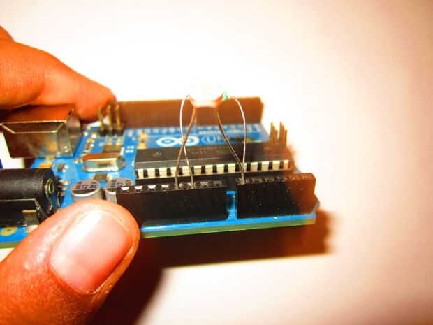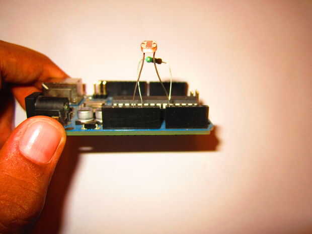 * Conecte la resistencia a los pines A0 y Gnd. * Coloque el LDR en A0 y 5 pernos V. * Colocar un LED con el lado más largo en pin 7 y el lado más corto en el pin 6. * También colocar el zumbador con el lado más largo en el pin 11 y el lado más corto en el pin de Gnd.