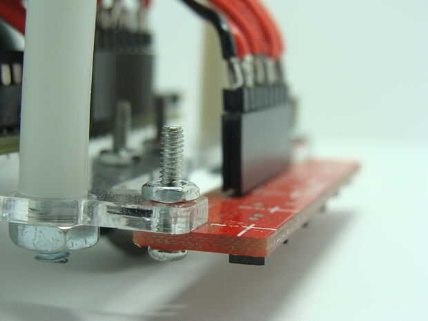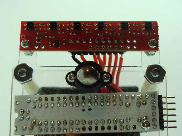 Pernos de la matriz del sensor en la parte delantera del robot usando tornillos de #2. El pasador en el extremo izquierdo del sensor es GND y obtiene conectado a GND de Arduino. El segundo eje más izquierdo es Vcc y obtiene conectado al pin de 5V de Arduino. Los pines marcados 6-1 en el sensor analógico Haz conectados a los pines de Arduino analógicos de 5-0. Así que pin 6 en el sensor obtiene con cable con el conector analógico Arduino 5, pin 5 del sensor obtiene atada con alambre al pin analógico Arduino 4, etc..