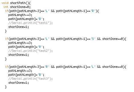La función más detallada es la de acortar el camino. Una letra es almacenada en cada cruce que indica que la dirección del robot tomó. Si la carta anterior era una "B", indicando un giro equivocado, se ejecuta la función que se acorta el camino para sustituir letras en lugar de esas secuencias de 3 letra descritas anteriormente.