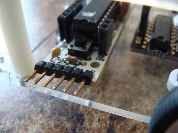 Luego de la soldadura de una tira de 9 pines de mujeres encabezados en el lado izquierdo del tablero de pins rotulado "5v" al "A0". Esto se acoplará con la clavija del sensor más adelante. La soldadura de una tira de 4 pines de mujeres encabezados en el lado derecho del tablero de pins rotulado "D5" al "D8". Estos pernos se utilizará para controlar el regulador del motor. Finalmente soldar una franja de 2 pines de mujeres encabezados en la parte frontal derecha de la Junta sobre los pines GND y 5V. Estos suministran energía al controlador del motor.