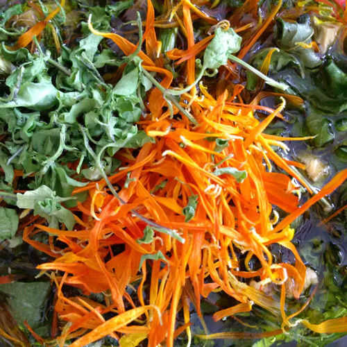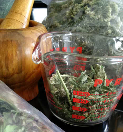 -Miden aproximadamente una taza de hierba seca (combinado milenrama, tiña y bálsamo de limón) en un recipiente de vidrio pyrex. Vierta suficiente aceite de semilla de cáñamo para cubrir sólo las hierbas.