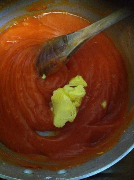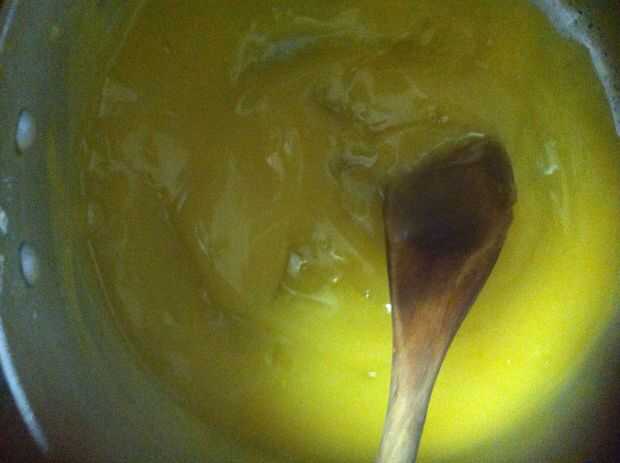 Cocine y revuelva a fuego medio alto hasta que espesó y burbujeante. Reducir el fuego a medio, luego cocinar y remover 2 minutos más. Retire del fuego. Revuelva mezcla caliente 1/2 taza de yemas de huevo y luego regresar todo a la cacerola, revolviendo constantemente. Llevar a un hervor, luego cocinar y remover 2 minutos más. Añadir alimentos naranja colorante para ajustar el color a naranja. Agregue mantequilla y mantener caliente. Espolvorea la ralladura.