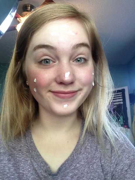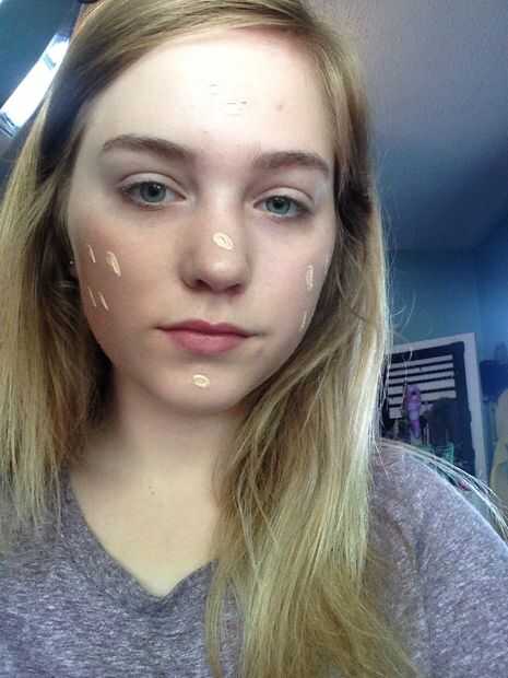 Siempre hacer mi BB Cream y Fundación antes de corrector, así que vamos a empezar con eso. Colocar unos puntos de crema en cada mejilla, uno en la barbilla y la nariz y dos en la frente. Utilice movimientos circulares mezcladoras para brillo en la piel. Entonces, utilizo el mismo método con una capa de Fundación para cobertura adicional un poco.