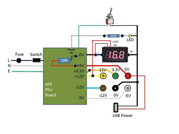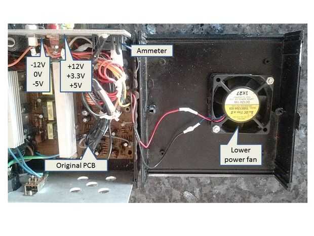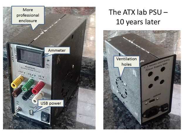 Todavía estoy utilizando la fuente de alimentación original aunque ahora está empaquetado en un caso más profesional. También he añadido un amperímetro en la línea V 0 por lo que pude medir los amperios que entrega. También he añadido una toma USB para cargar dispositivos USB. El último diagrama muestra un esquema simplificado de las partes.