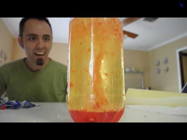 En este video tutorial voy a mostrar u hacer una lámpara de Lava en casa-Agregar 3/4 de taza de agua en botella de refresco-Rellenar el resto con aceite vegetal-Añadir alguna gota de colorante alimenticio (~ 10 gotas)-Rotura en media tableta de Alka-