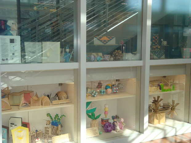 Esta es la zona frontal de la ventana y la pantalla de nuestro laboratorio.  La ventana muestra trabajo actual incluyendo láser cortar formas de sector matemática;  escultura de cadena que utiliza marcos de corte por láser; laser-corte juguetes móviles mecánicos; Manualidades de papel pop-up 3D (generado por el software); escultura de papel poliédrica (generado por el software) hypergami; y un barco de paleta fabricado en nuestro primer año de ingeniería clase de proyectos que utiliza laser corte y mecanismos de impresión 3D.