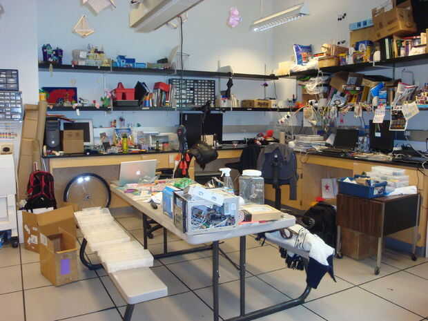 Aquí es una visión amplia de grad estudiantes trabajo área parte del laboratorio.  Ben Leduc-Mills proyecciones cubo ut es hacia la parte posterior.  También en la foto son de Easigami de Yingdan Huang y Craftopolis de Jane Meyers.