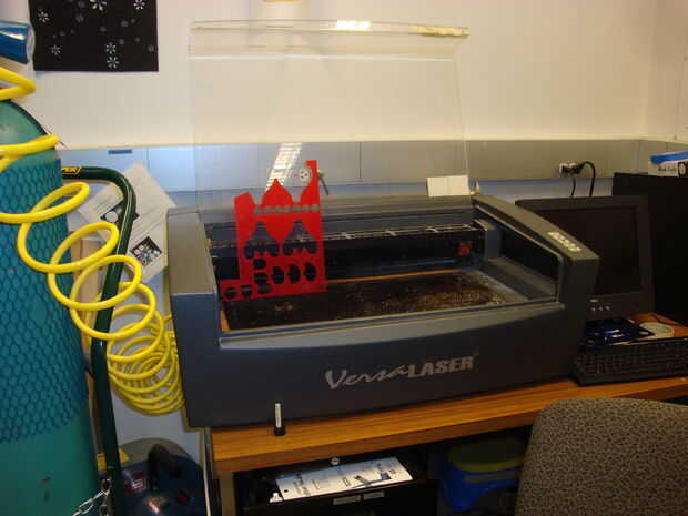 Aquí es nuestro caballo de batalla: una 300 de VersaLaser.  Lo tenemos conectado a una fuente de nitrógeno para reducir algunos del factor de la quemadura ya que cortar mucha madera.