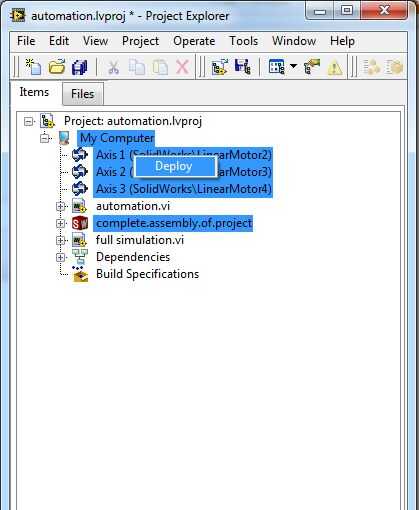 Iniciar el panel frontal de Labview y haga clic con el botón derecho Asamblea de solidworks en la ventana de proyecto y seleccione iniciar simulación.