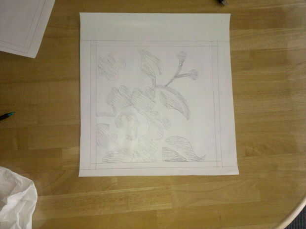 Como he dicho, utilicé un proyector de magna para trazar el diseño en la mía. Porque estaba tratando de soplarlo para arriba tan grandes no he podido conseguir la imagen al foco, por lo que era sólo un bosquejo áspero. Me senté e hizo volver a las líneas y añade algunos detalles más. Yo de color en las áreas que debían ser cortado. Esto ayudó mucho porque es difícil saber en algunos puntos qué parte cortar y qué parte a mantener.