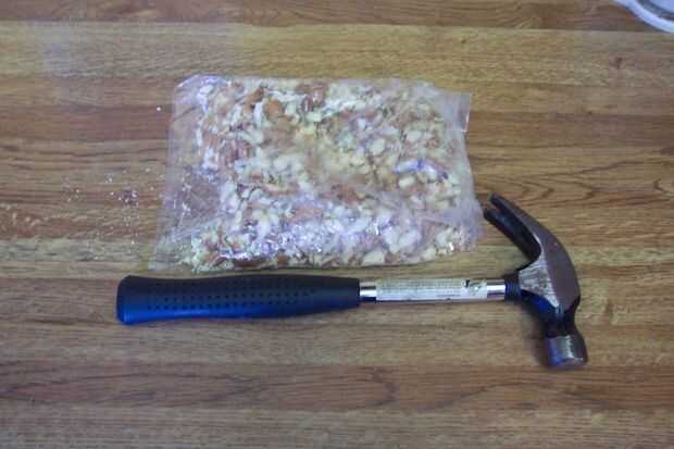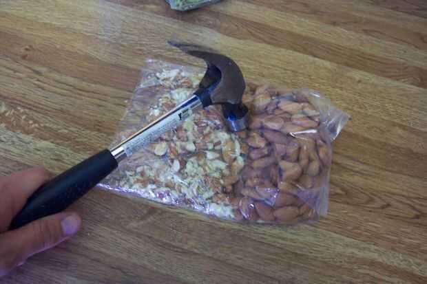 Para las almendras, estoy rompiendo los en trozos bastante grande dentro de una bolsa con un martillo.