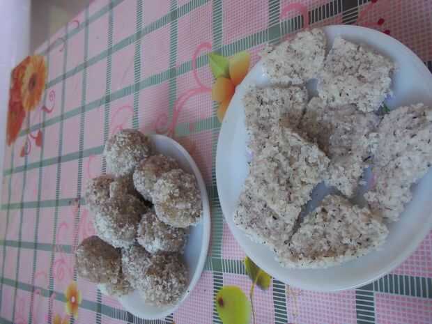 Hacer bolas o Laddoos (o barfis en forma cuadrada) con la mezcla y cubrir con el polvo de coco seco.