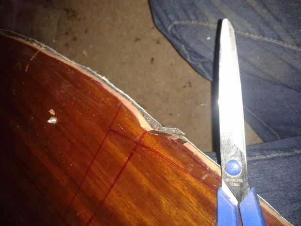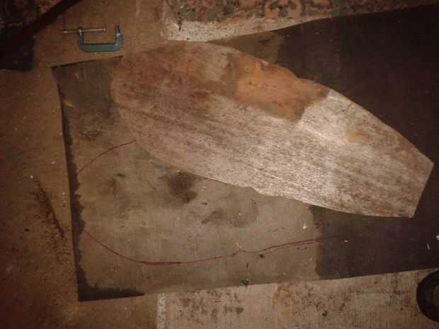 Tomar el epoxi y delinear al tejido coloque sobre la madera, abrazadera y volver en el tiempo unas horas. Una vez que el epoxi se le puede recortar los bordes exceso o doble sobre y epoxy otra vez pero esta vez hacia los lados.