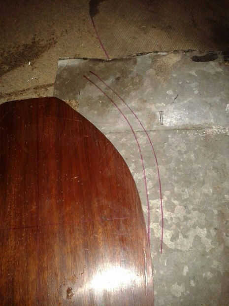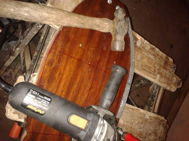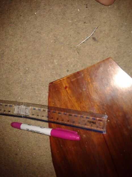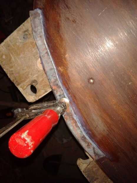 En primer lugar, dibujar el borde sobre el metal con su marcador y luego mover el borde hacia el interior de 1.5-2cm y dibujar otra vez. Usando el cortador de disco, corte la forma antes de epoxying a la madera. Arena, pegamento, abrazadera, esperar.
