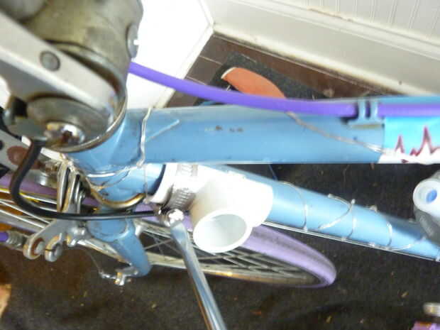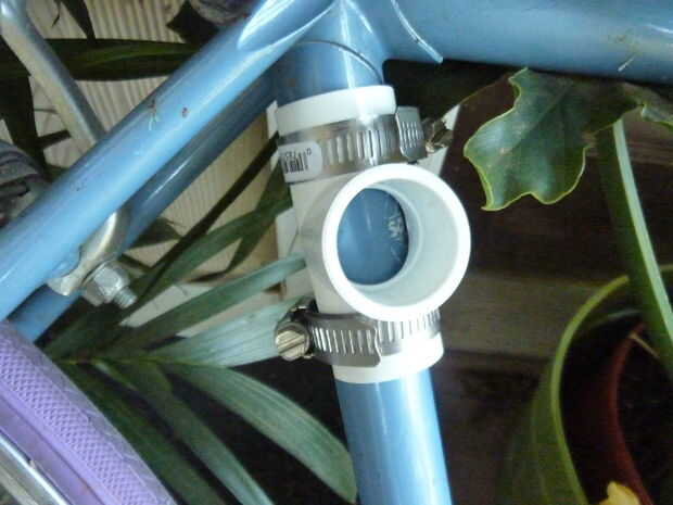 Se necesita 2 abrazaderas por T conjunta. Apriete las uniones con una cabeza plana Destornillador y asegúrese que estén bien sujetos. En mi bicicleta de carretera coloca una articulación de T en la parte superior del tubo del asiento y hacia la parte delantera del tubo hacia abajo. Decidí llevar mi crash pad en el lado izquierdo tráfico de la bicicleta por lo es donde ves conectado.