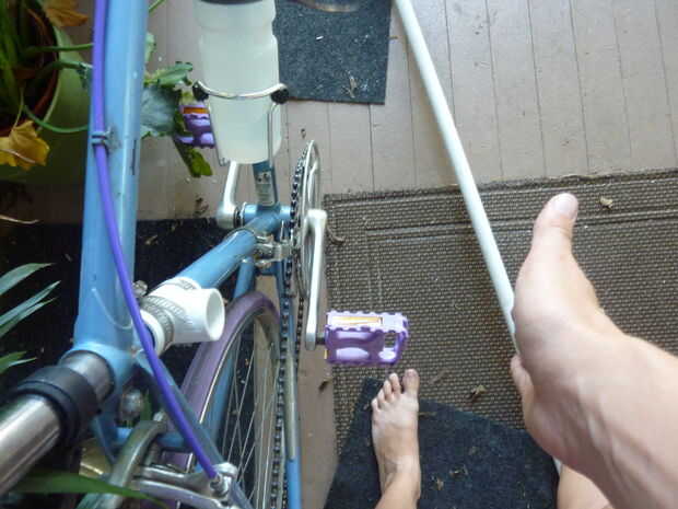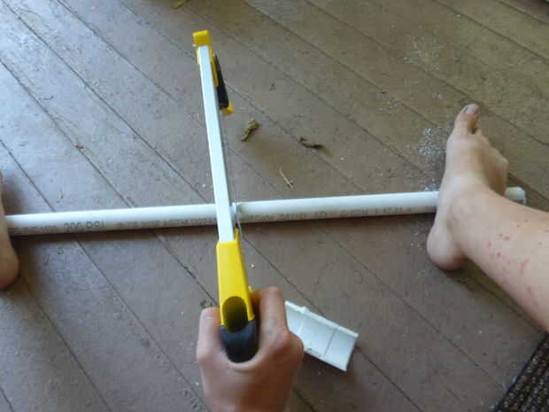 Lo primero que tienes que hacer es medir tu distancia de carrera del pedal (fotografiado). Dése una pulgada extra de espacio para los zapatos más grandes. Esta distancia es la primera pieza que conecta el empalme en T para el resto de la compañía (ver siguiente foto, con la primera pieza conectada - éstos son más de lo que he utilizado en el modelo final)