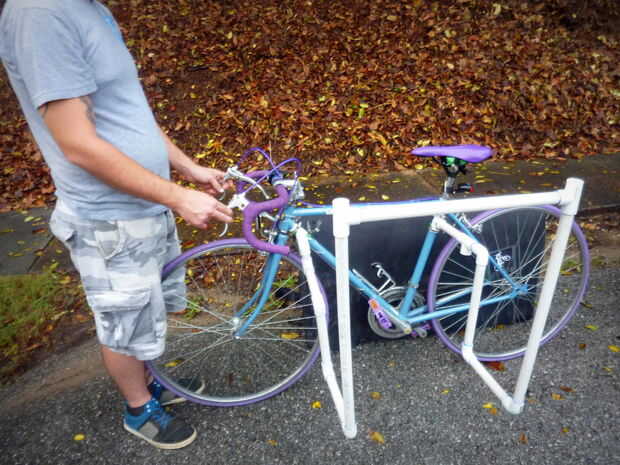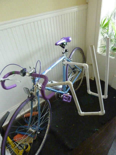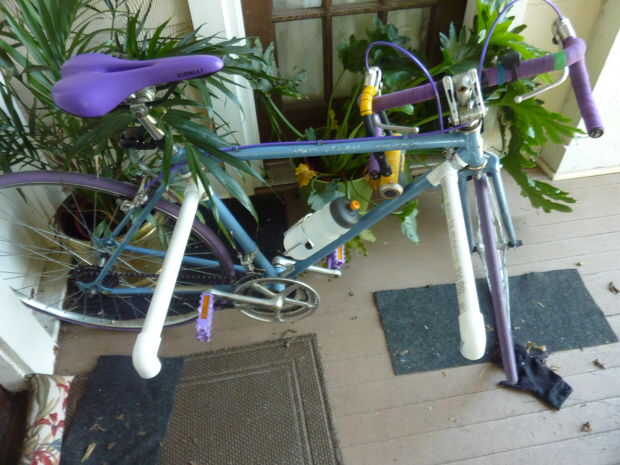 Si usted está teniendo problemas para conseguir el primer empalme y el primer bar para manillares de la gota, sugiero hacer las siguientes modificaciones: se hará un pequeño hacia atrás forma de S con un adicional de 2 codos y cortan su primera pipa del PVC (pero sólo el que está al frente de la compañía) (la primera conexión entre la articulación de la T en el marco y el resto de la compañía) para que tenga varias piezas : un pequeño (< 3" de largo) pieza que va sobre la T conjunta... luego fije un codo un trozo algo más grande pero aún pequeño bajando de esta, añadir otra pieza de codo y su sección restante de PVC. Usted también necesitará cortar la pieza de abajo que va en la parte trasera del cojín del desplome, ya que ahora será demasiado largo. Usted puede ver esta modificación en las ultimas fotos de este conjunto, pero podría tener que ajustar su bicicleta